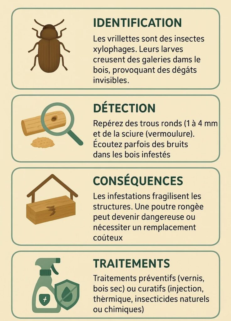 Il est recommandé d’effectuer une inspection régulière, au moins tous les 5 à 10 ans, ou en cas de signes visibles : bois vermoulu, poussière de sciure (appelée « sète »), tâches d’humidité, présence de galeries ou fragilité du bois. Un traitement rapide à Fréjus évite la propagation des insectes et la dégradation approfondie de votre structure.